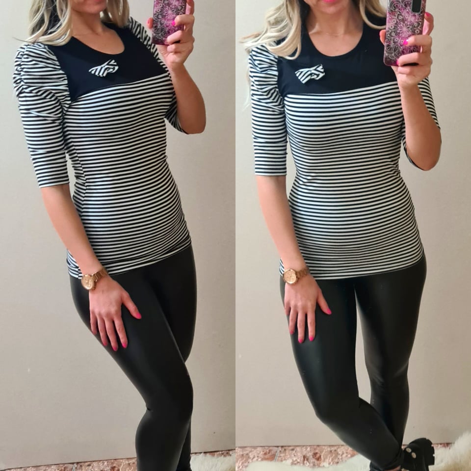 Dámská tunika s proužky má pružný materiál, nařasený rukáv. Tuniku můžete je obléknout třeba k džínám.