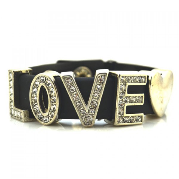 Trendy pryžový náramek s písmenky a cvočky. Zapínání na sponu.   Parametry zboží:   - Barva : černá + stříbrná - Délka: 22 cm - Šířka: 1,3 cm - Materiál: pryž celý popis
