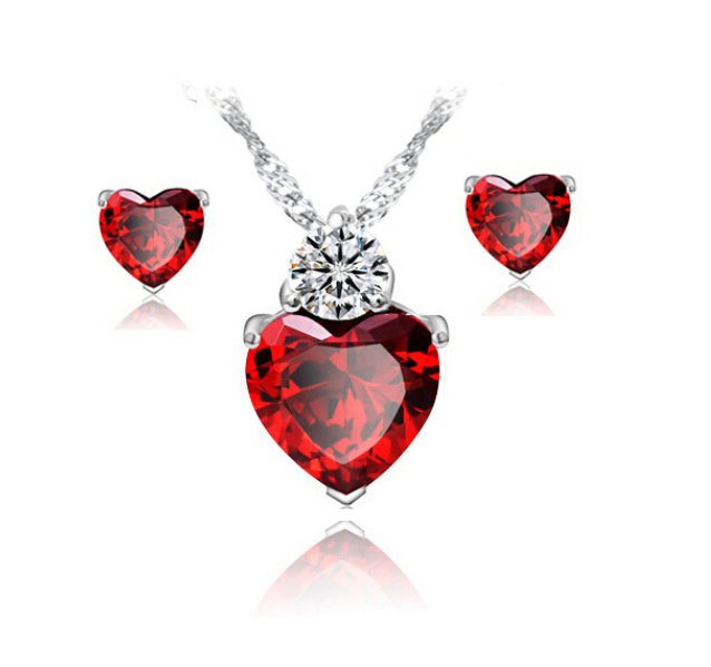 Souprava šperků, vyrobená z bižuterního kovu. Souprava obsahuje řetízek s přívěskem a náušnice. Dámský řetízek působí velice jemně. Zajímavou dominantou celého náhrdelníku je přívěšek se srdíčkem s broušeným skleněným kamínkem, který se třpytí. Náhrdelník je vhodný ke společenským událostem. Zapínání je na karabinku s adjustačním řetízkem. Drobné romantické puzetové náušnice - puzeta obsahuje kovovou zarážku proti vypadnutí