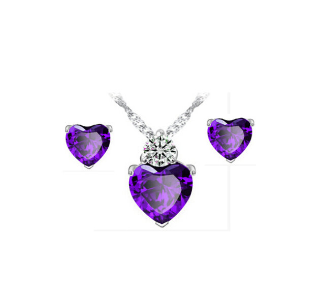 Souprava šperků, vyrobená z bižuterního kovu. Souprava obsahuje řetízek s přívěskem a náušnice. Dámský řetízek působí velice jemně. Zajímavou dominantou celého náhrdelníku je přívěšek se srdíčkem s broušeným skleněným kamínkem, který se třpytí. Náhrdelník je vhodný ke společenským událostem. Zapínání je na karabinku s adjustačním řetízkem. Drobné romantické puzetové náušnice - puzeta obsahuje kovovou zarážku proti vypadnutí.