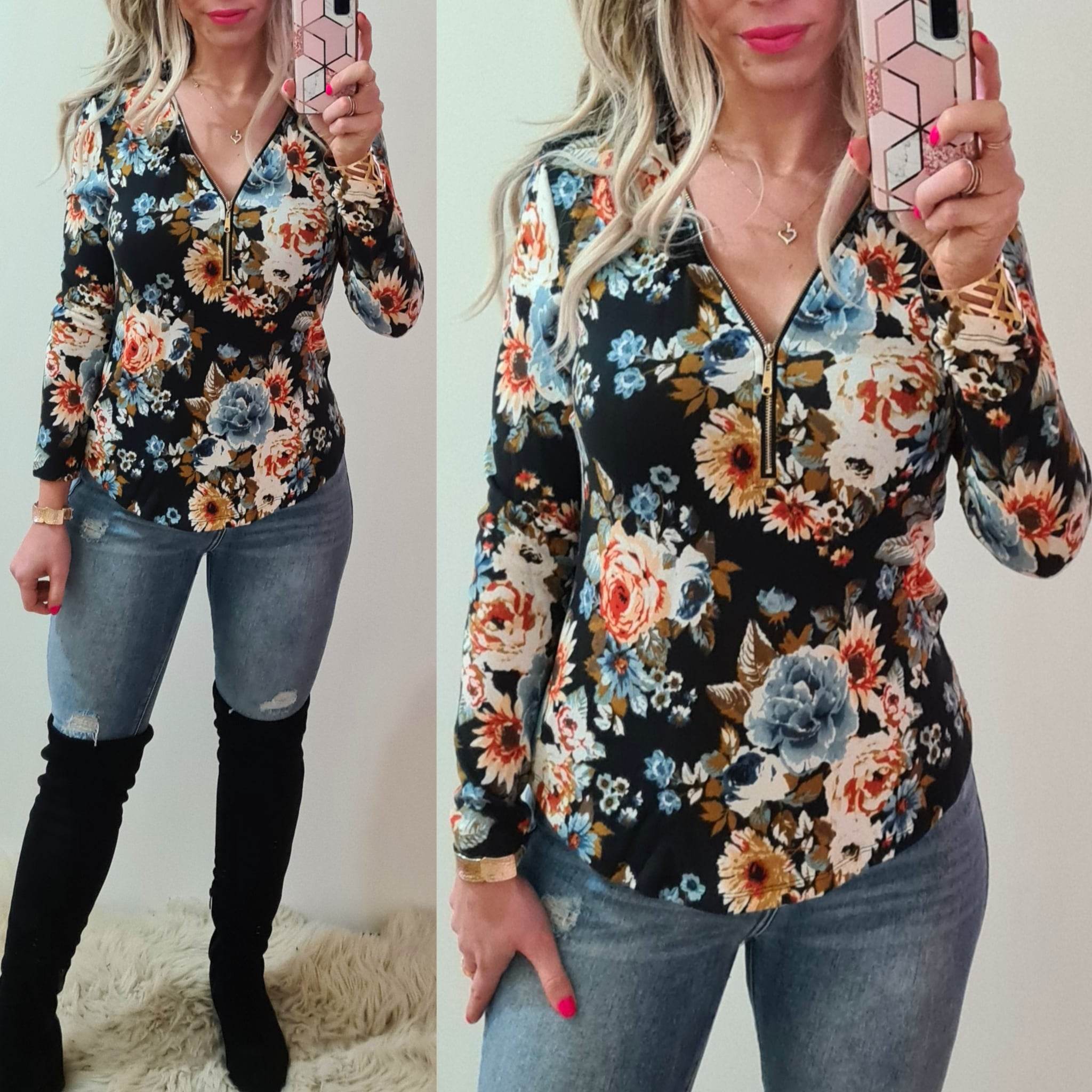Dámská halenka s květy a zipem černá