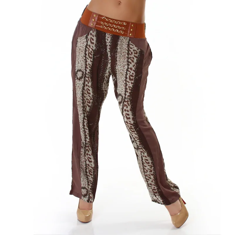 Dámské lehké kalhoty Rozměry: pas 70-85 cm, boky 120 cm, délka 97 cm Jedna univerzální velikost (pevná látka) pas do široké gumy vpředu ozdobený kovovými cvočky a řetízkem z boku kapsy lehký pevný materiál materiál: 100% viskoza celý popis