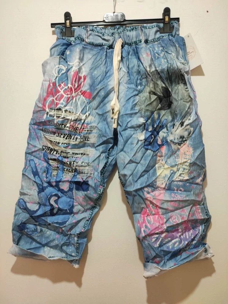 Dámské mačkané kraťasy RITA modré Rozměry: pas 70-105 cm, boky 120-135 cm, délka 72 cm Jedna univerzální velikost (první míra měřena v klidu a druhá míra po natažení) v pase do gumy + šňůrka z boku a vzadu kapsy imitace rifloviny elastický materiál materiál: 95% coton(bavlna), 5% elastan celý popis