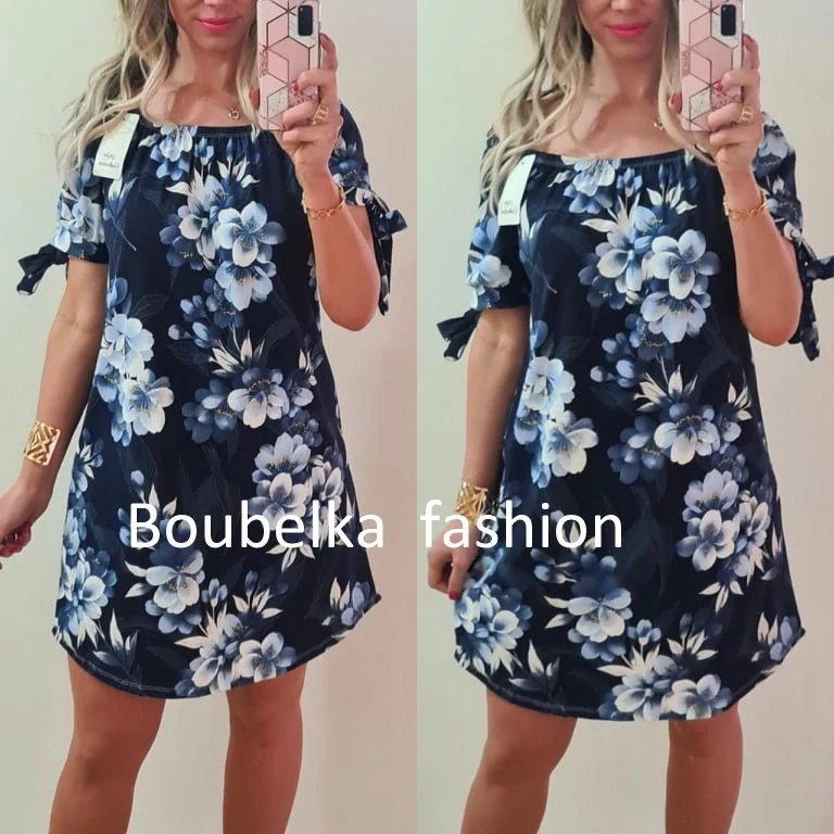 Dámské šaty LENINA modrá Rozměry:  prsa 110-120 cm, boky 115-120 cm, délka zadní 90 cm, přední 85 cm (první míra měřena v klidu a druhá míra po natažení) krátký rukáv s vázáním elastický materiál materiál: 95% coton(bavlna), 5% elastan celý popis