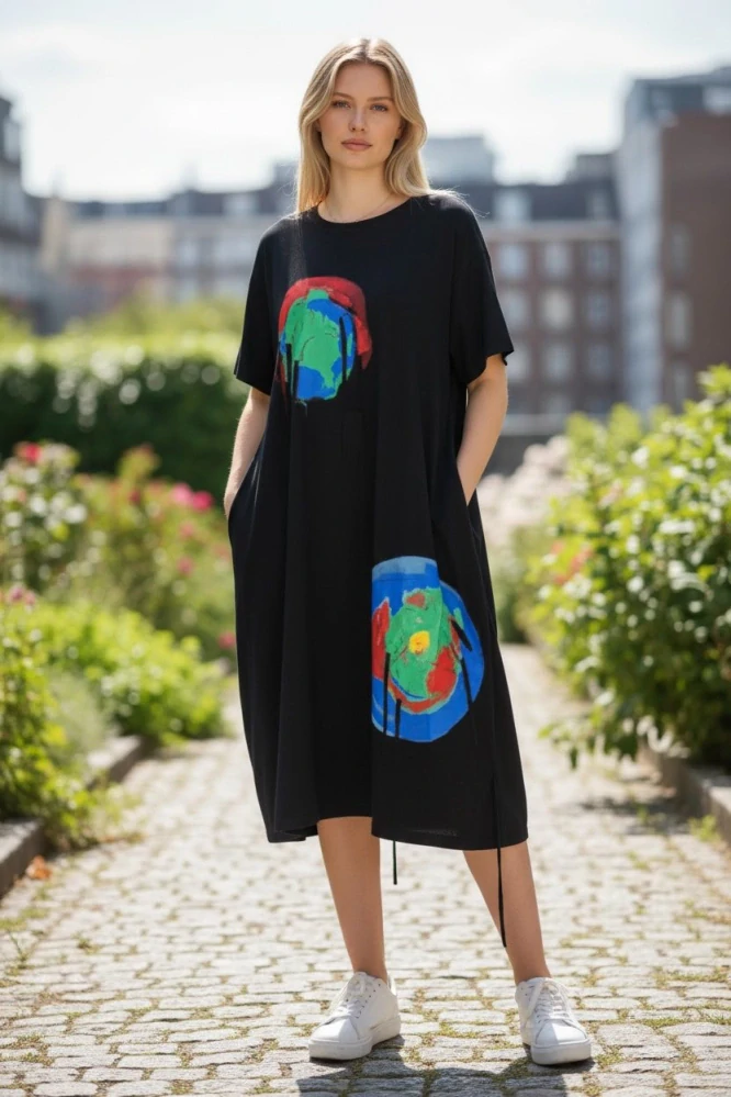 Dámské šaty ZUZA černá Rozměry: prsa 120-135 cm, boky 160 cm, délka 105/108 cm Jedna univerzální velikost (první míra měřena v klidu a druhá míra po natažení) krátký rukáv z boku kapsy vpředu obrázky se šňůrkami elastický materiál materiál: 95% coton(bavlna), 5% elastan celý popis