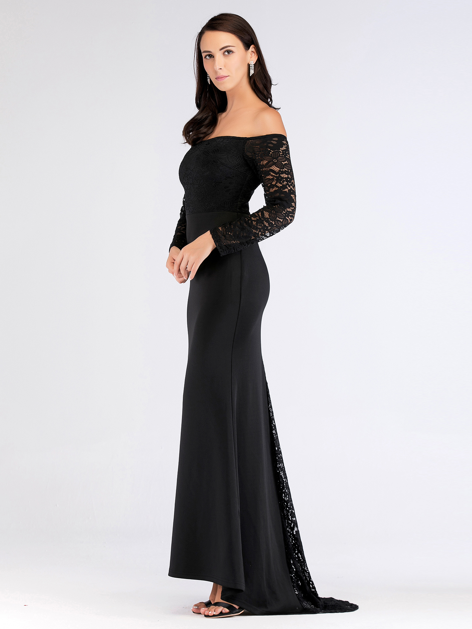Dlouhé společenské šaty s odhalenými rameny. Šaty pro každou slavnostní příležitost - ples, taneční, večírek, atd. Krajkový živůtek a rukávy, vzadu skrytý zip pro snadnější oblékání, delší krajková vlečka. Krásné šaty pro krásný večer....