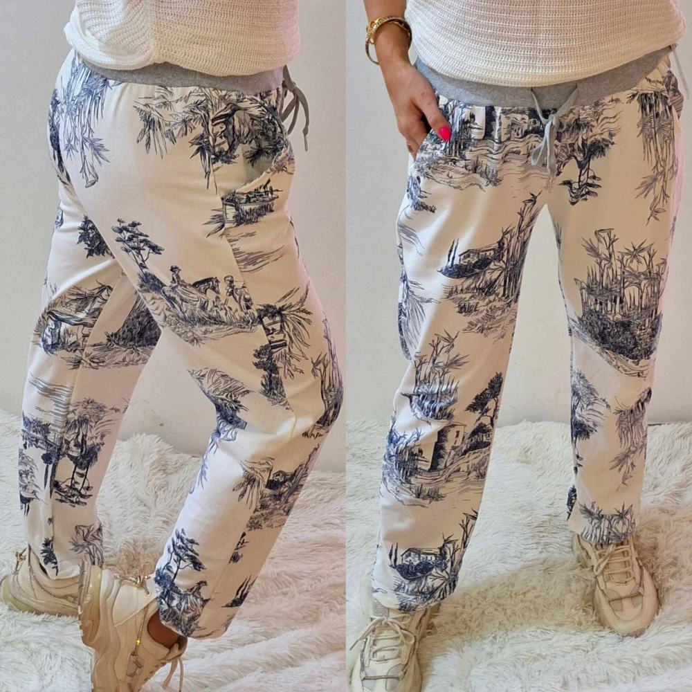 Dámské tepláky s potiskem bílá Rozměry: pas 80-120 cm, boky 120-140 cm, délka 100 cm jedna univerzální velikost (první míra měřena v klidu a druhá míra po natažení) v pase guma + šňůrka na stahování dvě kapsy elastický materiál materiál: 95% coton(bavlna), 5% elastan celý popis