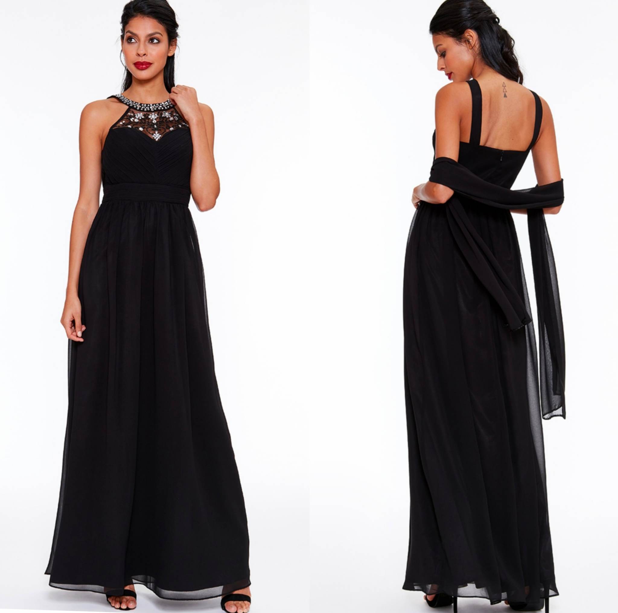 Dámské dlouhé šaty u krku zdobené našitými korálky. Atraktivní střih šatů vytváří dokonalou siluetu, vzadu skrytý zip pro snadnější oblékání. Šaty jsou vhodné kamkoli - pro společenské příležitosti, na večírky, plesy....K šatům je černý šifonový šál.